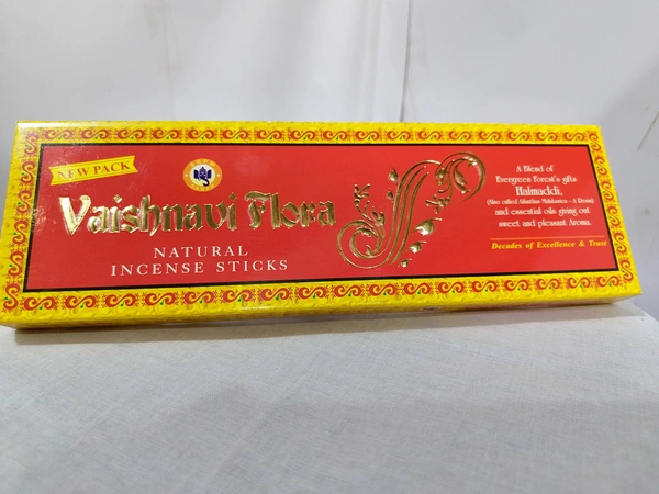 Vaishnavi Flora incense sticks are manufactured by Sree Gajanana Perfumery Works, India. Our incense sticks gives a light, gentle fragrance outburst. It promotes happiness and elevate the mood. Our incense sticks are made of Natural Resin, Halmaddi and Perfume.